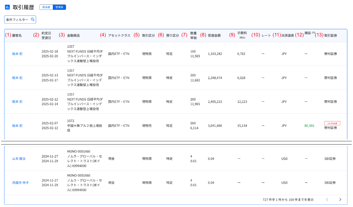| ② | 約定日・受渡日 | その商品が約定した年月日、受渡年月日をそれぞれ表示 |